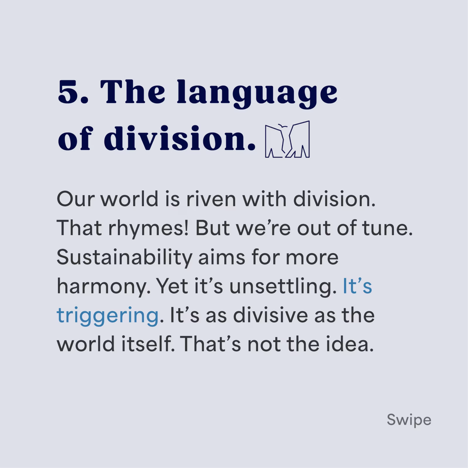Our world is riven with division. That rhymes! But we’re out of tune. Sustainability aims for harmony. Yet it’s unsettling. It’s triggering. It’s as divisive as the world itself. That’s not the idea.