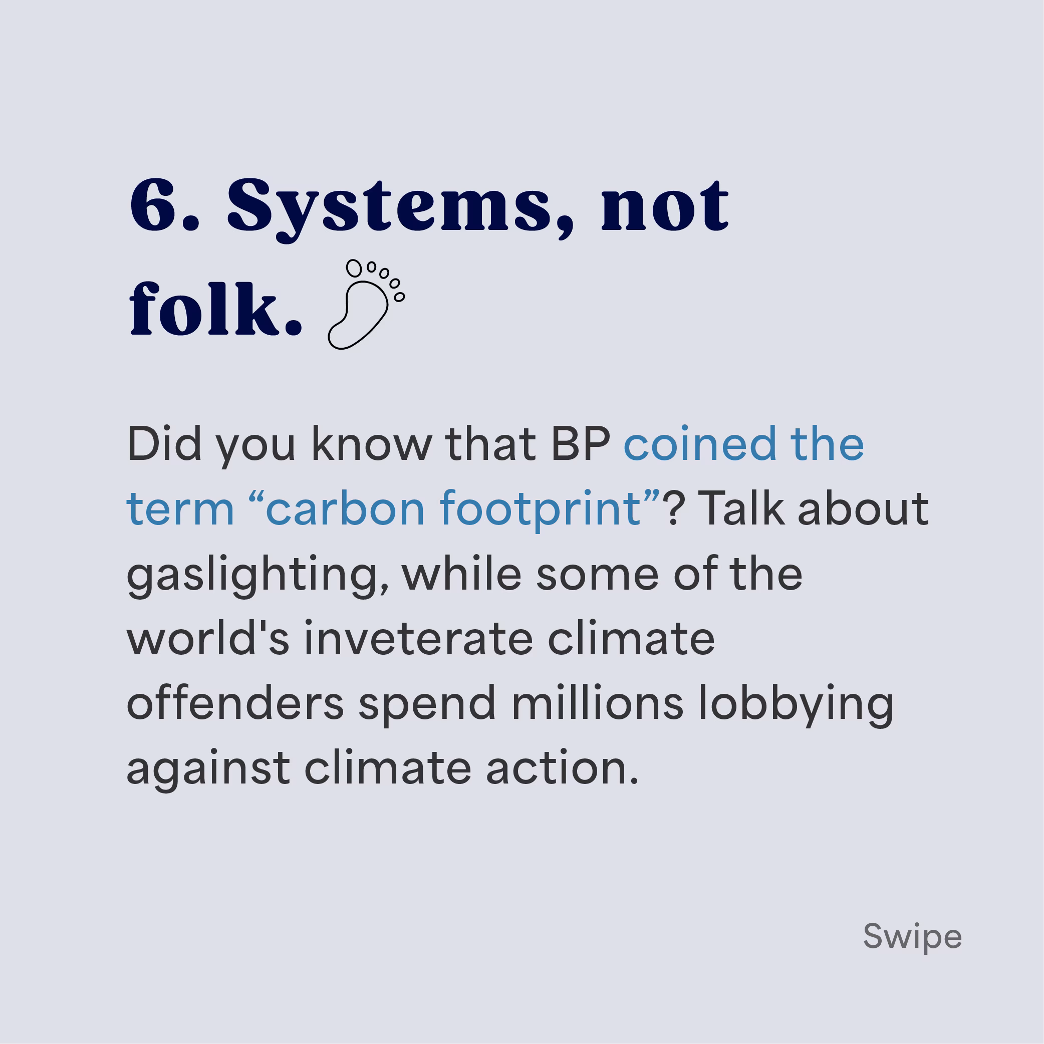 Did you know that BP coined the term “carbon footprint”? Talk about gaslighting, while some of the world’s inveterate climate offenders spend millions lobbying against climate action.